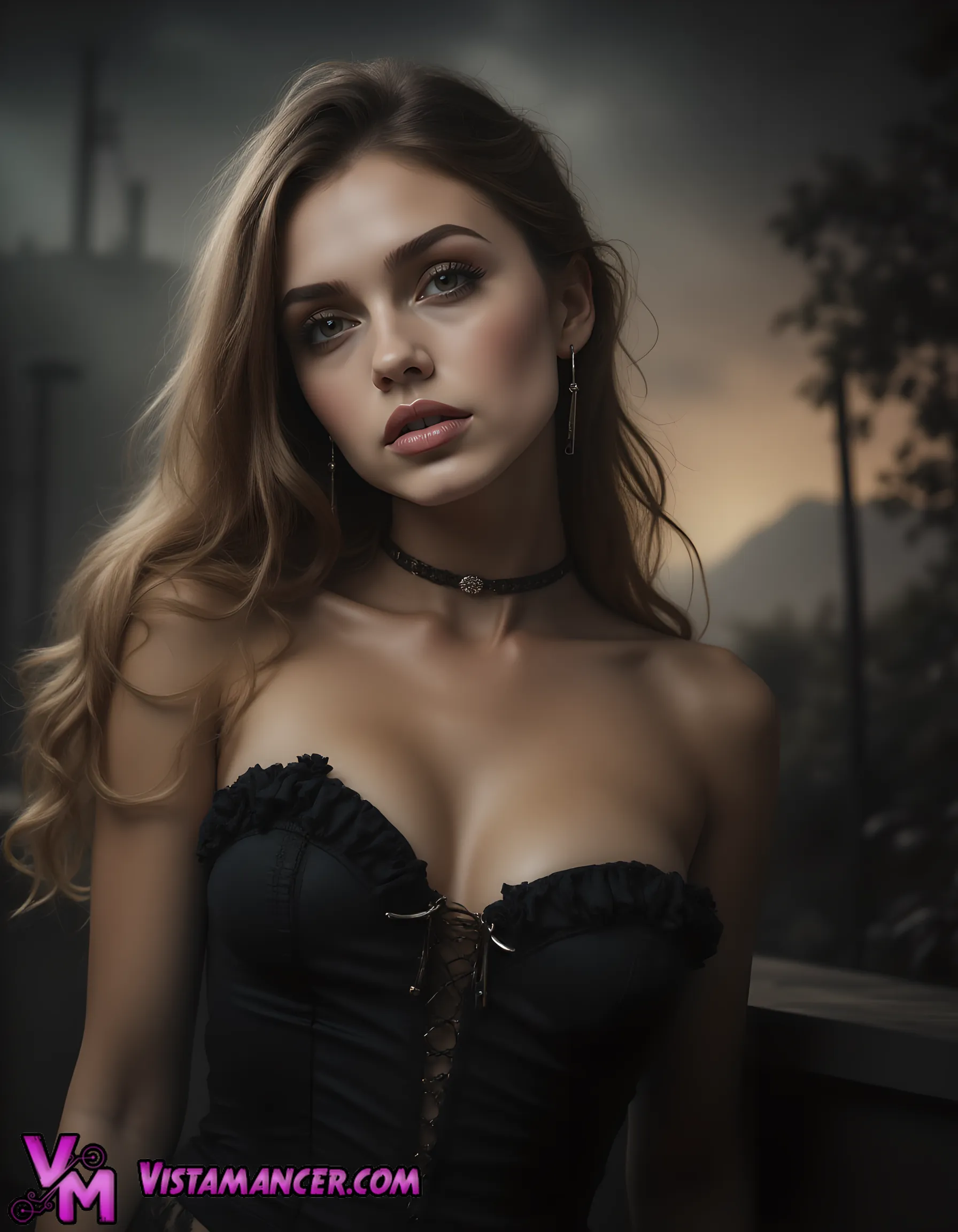 Keywords: blonde model in corset, gothic lace top fashion, misty forest sunset portrait, hazel eyes closeup, black choker necklace, seductive evening vibe, wavy hair beauty shot, off-shoulder lingerie look, twilight woodland scene, realistic digital photography, feminine empowerment aesthetic, fall dusk atmosphere, elegant boho goth style, high-fashion editorial, immersive nature erotica