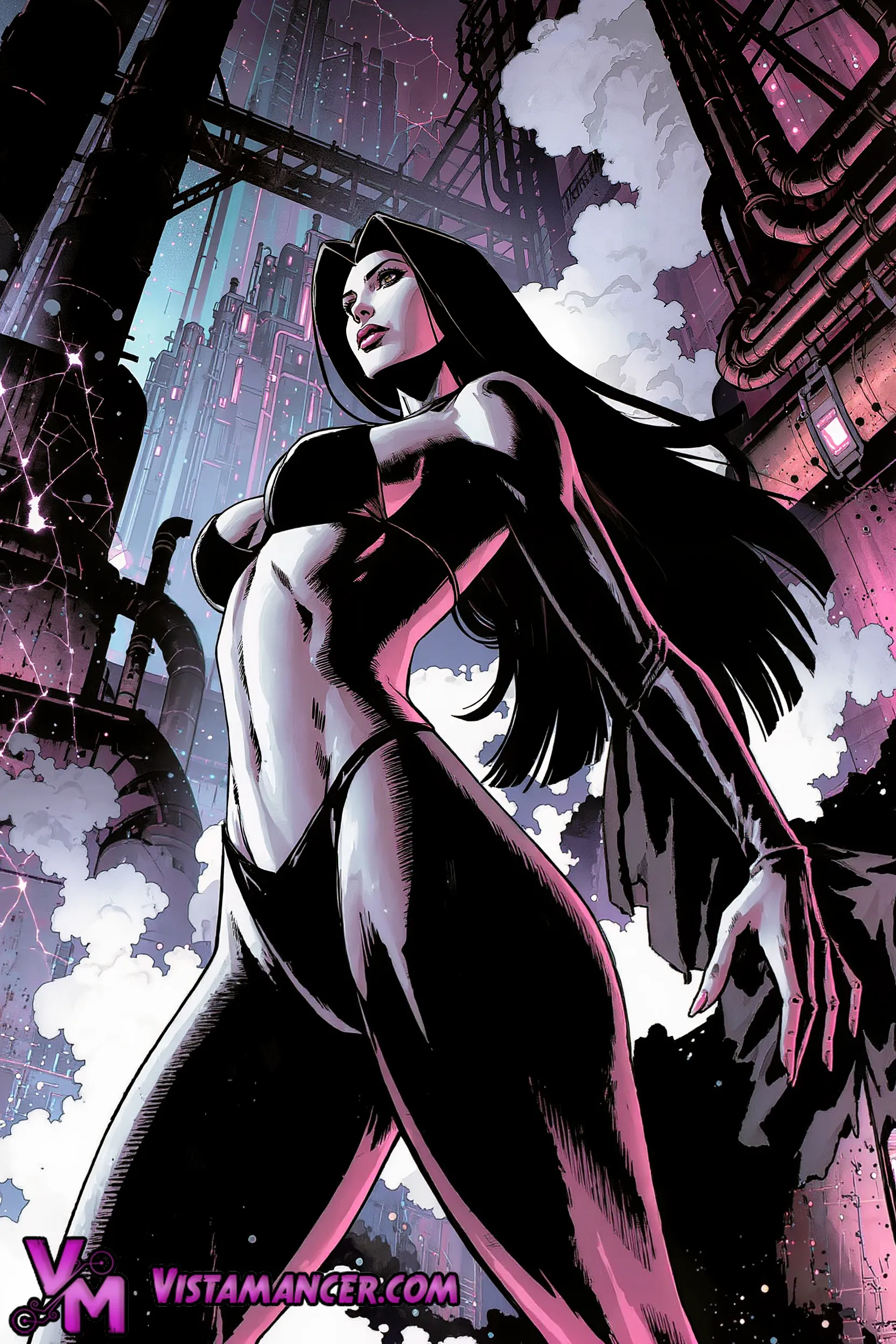She rises from the industrial underworld like a living force of will, framed by towering steel structures and glowing neon skies. Steam coils around her as cold city light cuts across her form, highlighting the contrast between polished metal environments and her sleek, shadowed presence. The vertical perspective makes her appear monumental, as if the city itself was built to elevate her power and dominance.